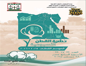 المركز الإحصائى لحركة الأقطان المصرية لموسم 2025/2026 من 01/09/2025 وذلك حتى 21/12/2025 .