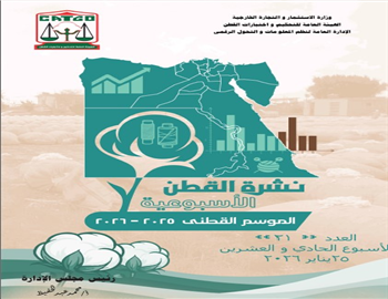 تم إصدارنشرة القطن الأسبوعية (الأسبوع الحادى و العشرون) موسم 2025/2026 والتى تتضمن أحدث إحصائيات لأنشطة تداول الأقطان المصرية وملخص لحركة السوق العالمى .
