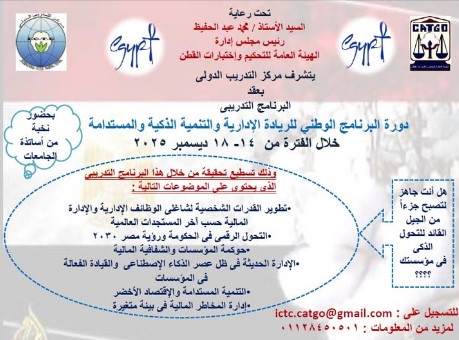 يعلن مركز التدريب الدولى ( إدارة تخطيط وتسويق البرامج التدريبية ) عن عقد البرنامج التدريبى ( البرنامج الوطنى للريادة الإدارية والتنمية الذكية والمستدامة)