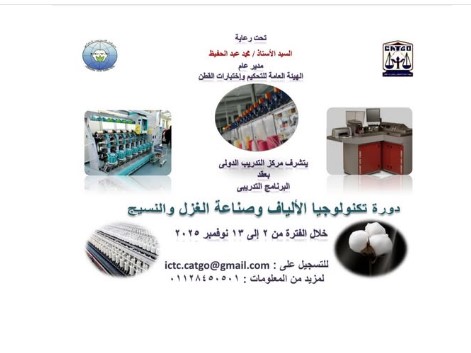 يعلن مركز التدريب الدولى ( إدارة تخطيط وتسويق البرامج التدريبية ) عن عقد البرنامج التدريبى ( دورة تكنولوجيا الألياف وصناعة الغزل والنسيج )