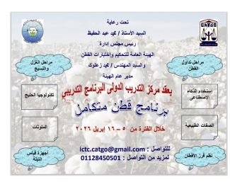 وتحت إشراف ا/ وردة حسام الدين - رئيس الإدارة المركزية للتدريب والتطوير و م / وليد المرسي – مدير عام مركز التدريب الدولي، ان يعلن عن البرنامج تدريبي " برنامج قطن متكامل "و ذلك خلال الفترة من 5 أبريل الي 16 ابريل ٢٠٢٦